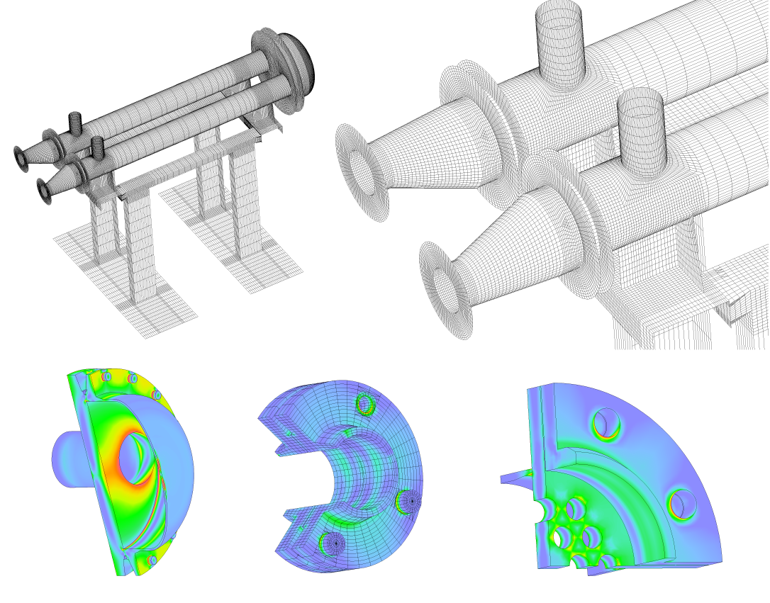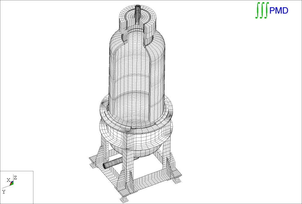 Na modelu bylo řešeno stacionární teplotní pole, elastostatická a seizmická odezva konstrukce. Výsledky byly hodnoceny metodou kategorizace napětí dle NTD A.S.I. Síť je tvořena 235-ti tisíci uzly, 79-ti tisíci prvky.